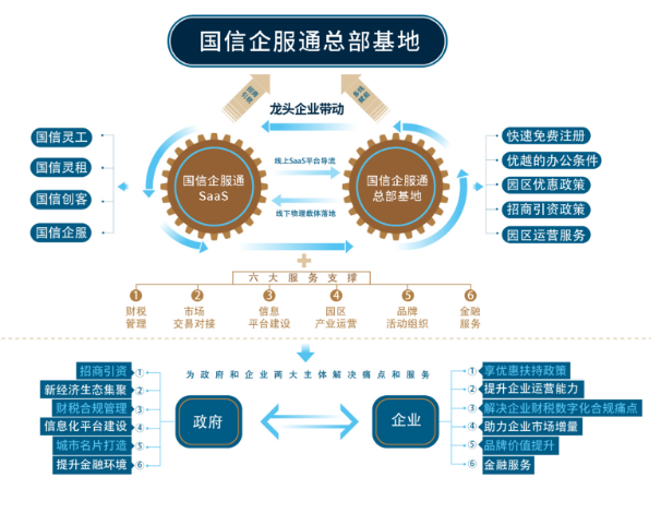 “1+1+6”的产业模式,打造国信区域总部基地,国信双创构建了“1+1+6”的产业模式,即以线上“国信企服通SaaS“管理平台+线下“国信创新自由港”空间载体为双核驱动,同时借助六大服务支撑,推进国信总部基地的落地。